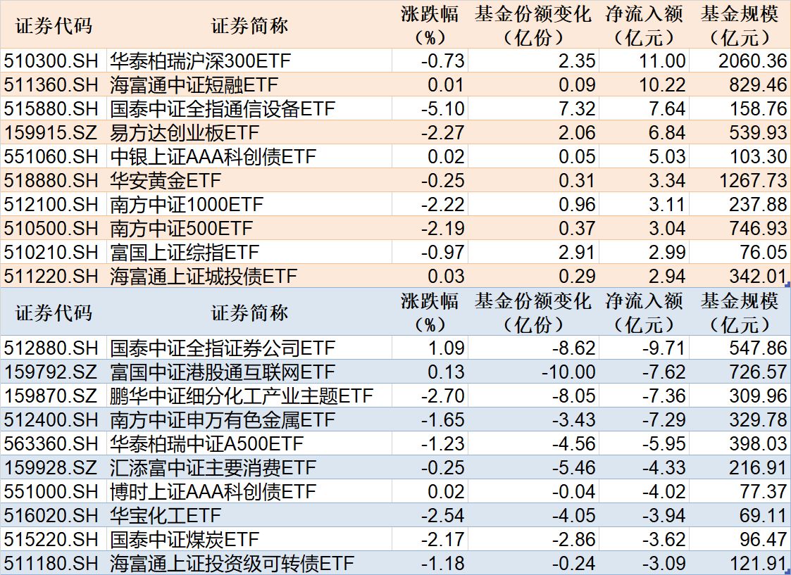 與此同時,國泰中證全指證券公司ETF基金份額減少8.62億份,凈流出額9.71億元;富國中證港股通互聯(lián)網(wǎng)ETF基金份額減少10.00億份,凈流出額7.62億元;鵬華中證細分化工產(chǎn)業(yè)主題ETF基金份額減少8.05億份,凈流出額7.36億元。