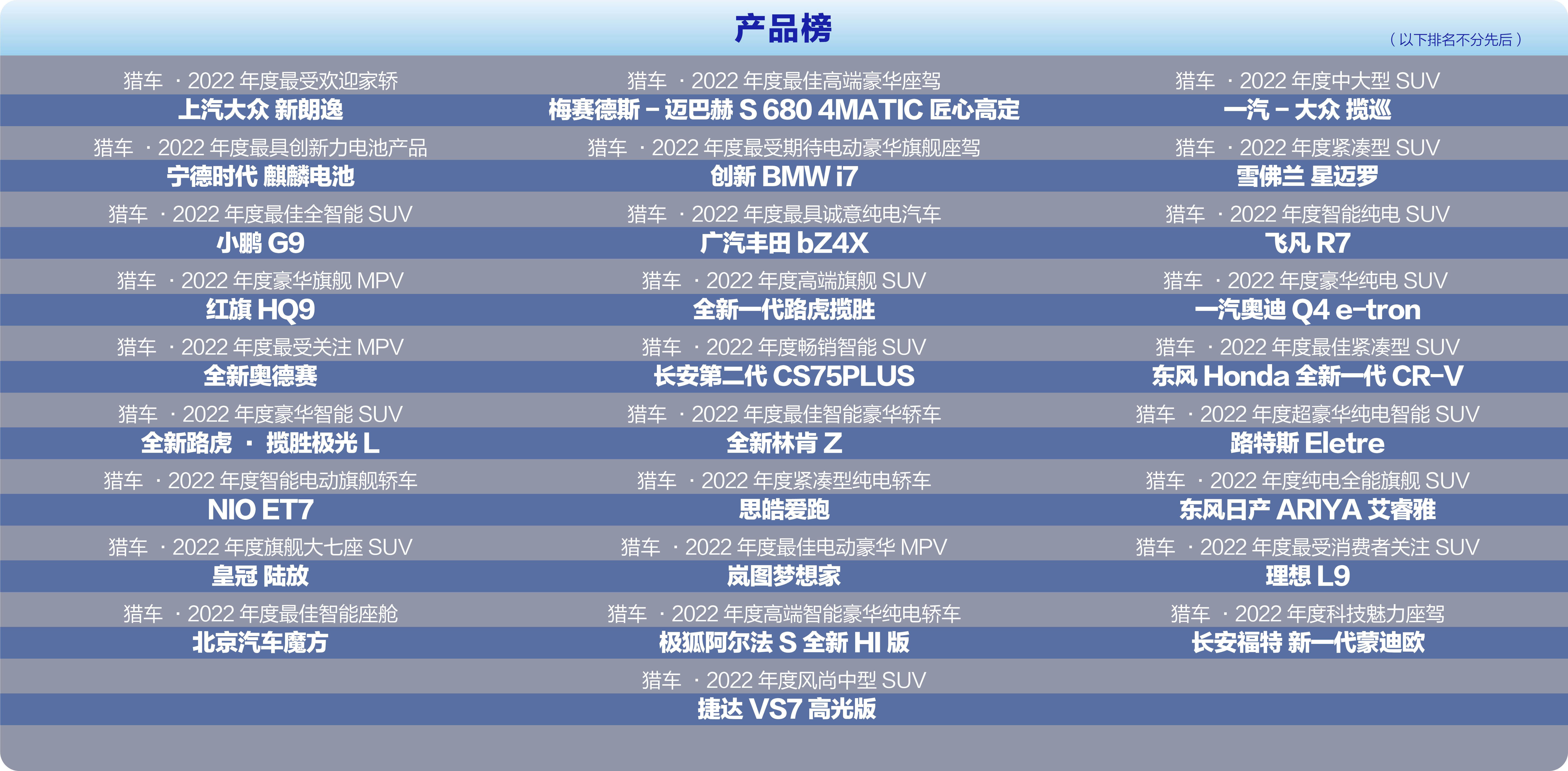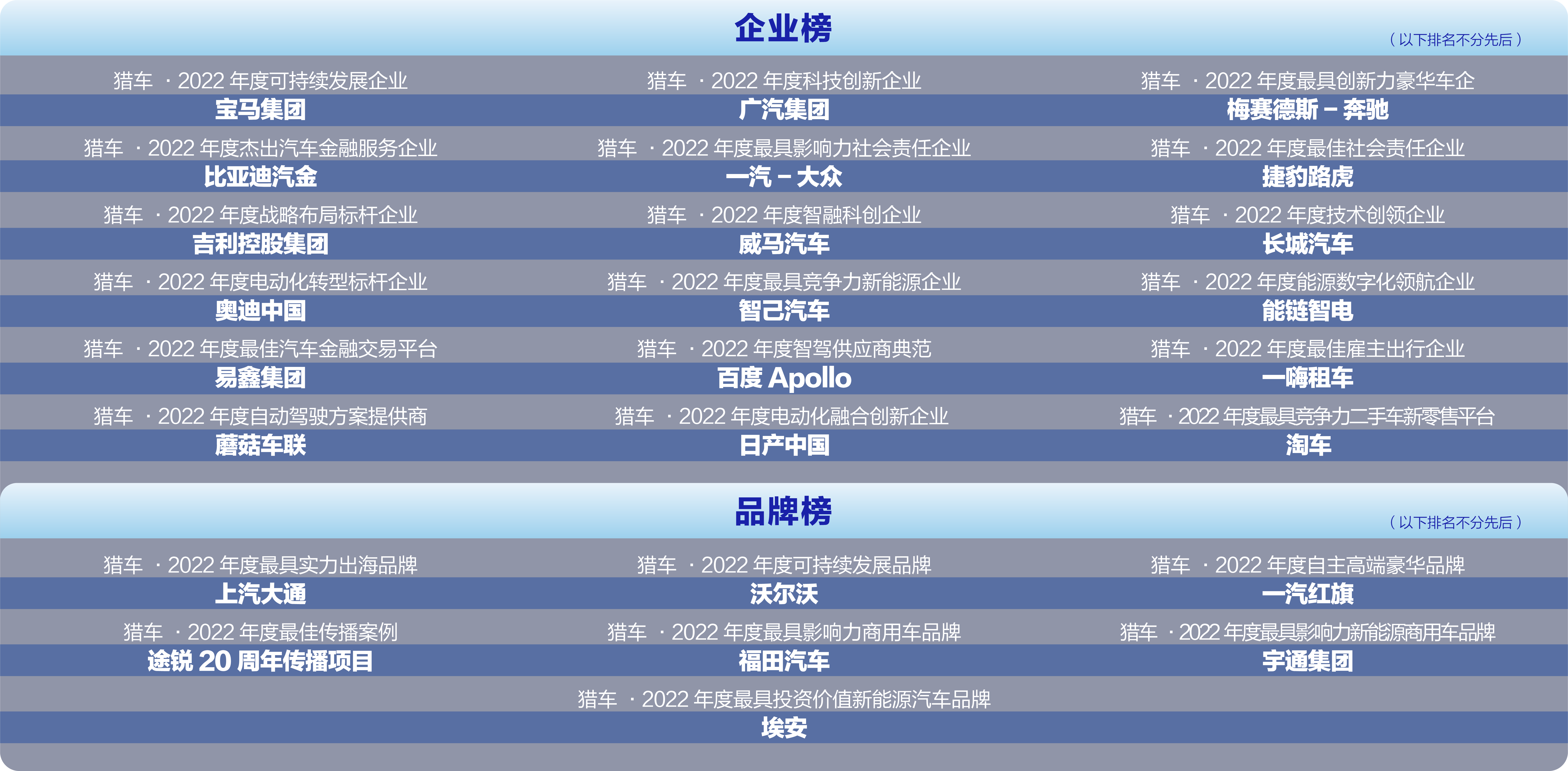 “中國獵車榜” 由每日經(jīng)濟(jì)新聞?dòng)?008年正式發(fā)起,旨在作時(shí)代變局的見證者,汽車產(chǎn)業(yè)革新的推動(dòng)力。 十余年來,中國獵車榜始終堅(jiān)持“公開、公平、公正”的原則募集獎(jiǎng)項(xiàng)申請,組織行業(yè)專家和知名媒體人進(jìn)行集中評審,全面覆蓋整車企業(yè)及產(chǎn)業(yè)鏈上下游企業(yè),獲得了行業(yè)同仁的認(rèn)可和大力支持,如今,中國獵車榜已成為行業(yè)最具權(quán)威和影響力的獎(jiǎng)項(xiàng)評選之一。 基于此, 《每日經(jīng)濟(jì)新聞》 將于2022年11月23日在線上舉辦以 “向新而生 創(chuàng)享末來”為主題的第十四屆中國獵車榜,與行業(yè)專家、高校學(xué)者、企業(yè)高管相聚云端,共話未來!